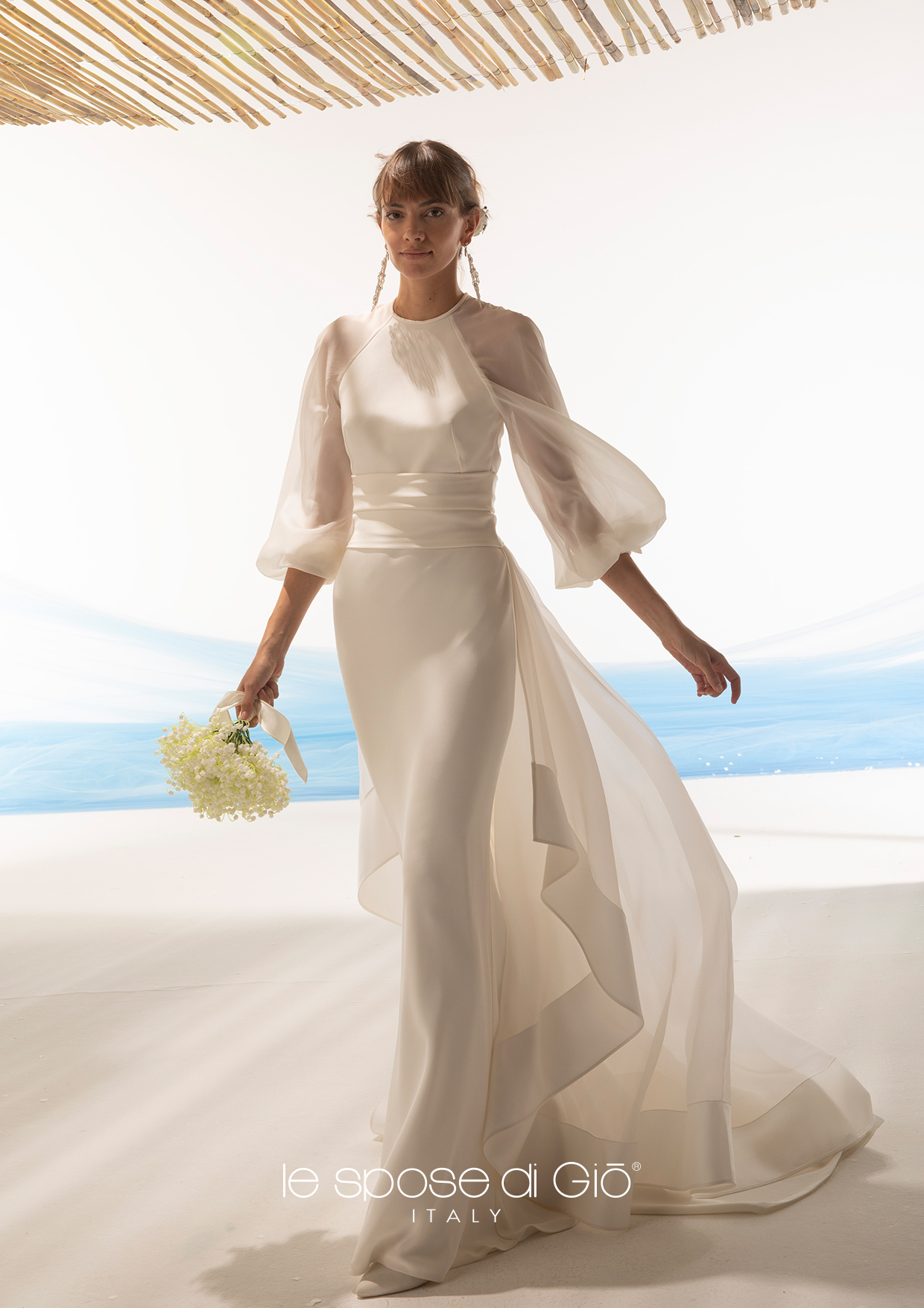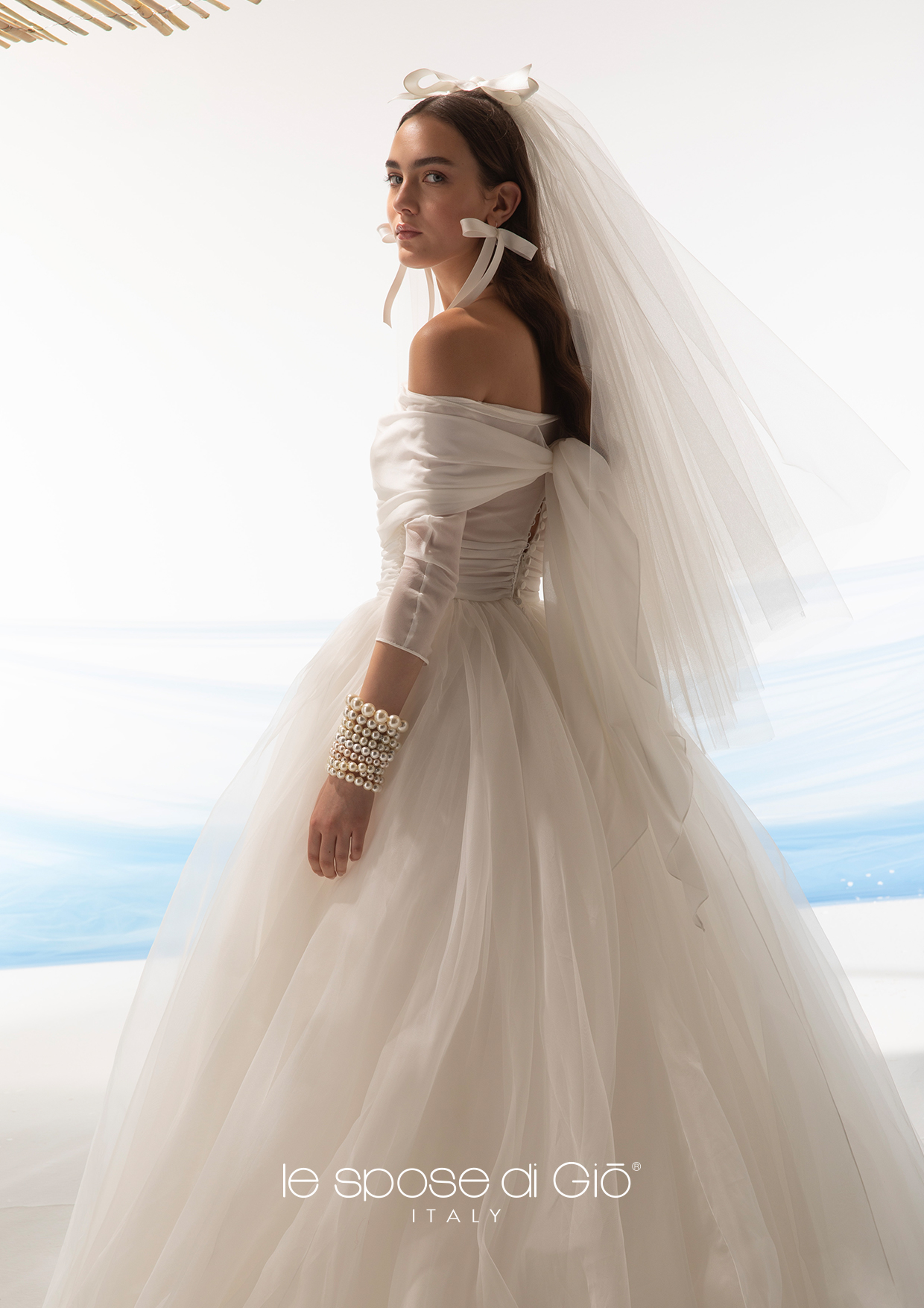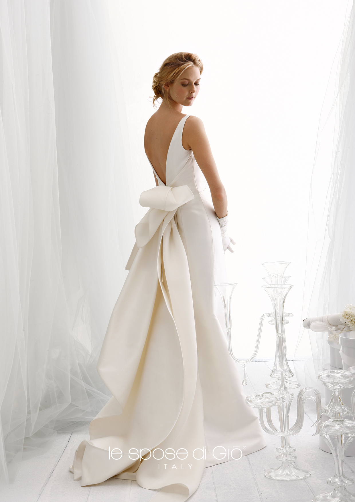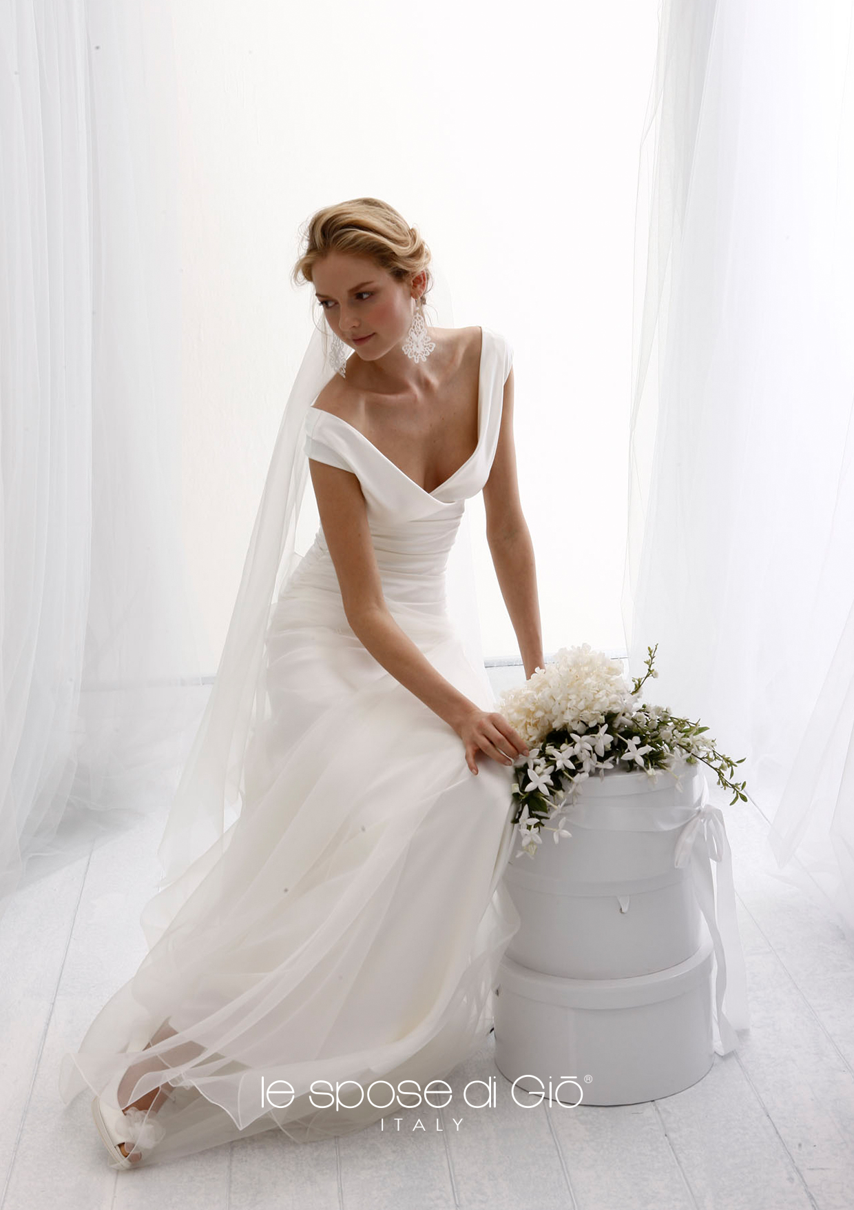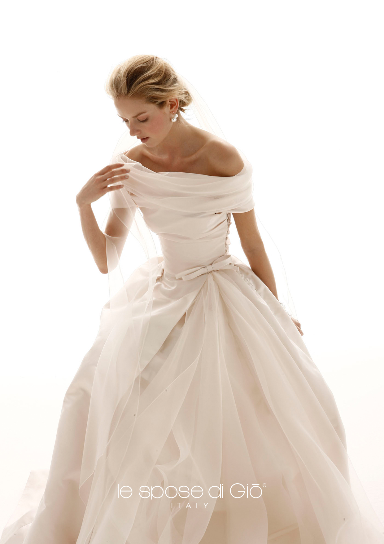Our bridal gowns are entirely produced in Milan, with Italian fabrics according to the best tailoring tradition that we carry on since more than thirty years. Our team of dressmakers,cutters, embroiderers, guarantees an high qualitative standard and an extreme easiness in making adjustments. The dresses by Giò are produced after a careful fitting and choice of the fabrics. The cut and the materials of our dresses are unique and it is important to wear them to understand the difference.
