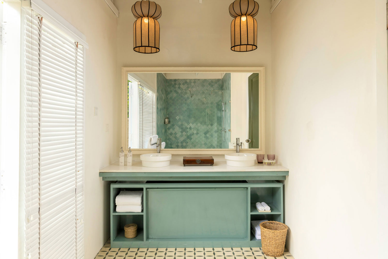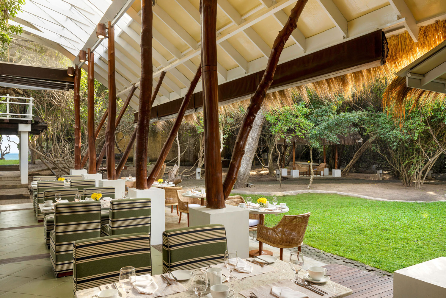 A restrained, natural palette – white-washed beams, dark rustic wood, crisp linens, and olive-and-cream textiles – echoes the gardens beyond the open edge. Cane dining chairs and tactile furnishings reinforce a tropical sensibility that feels authentic and grounded in natural materials.